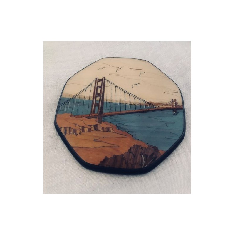 Sorrento Italy is famous for the Inlaid Wood productions and this larger sized coasters is unique to Gioia. This is a scene of the San Francisco Golden Gate Bridge. Measures almost 5 inches. Detailed work made by hand. Great for shipping to loved ones.