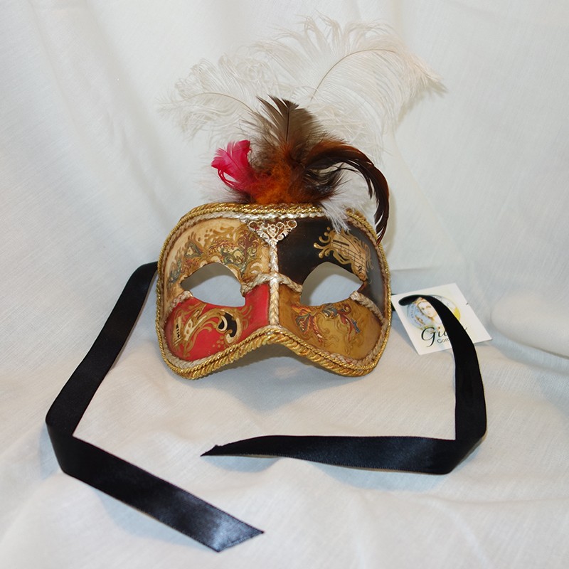 Hand made and decorated using Florentine papers and music design with red and gold leaf and gold and silver trim with feathers on traditional paper made mask using the 16th and 17th century style of mask making in Italy by award winning artist. This mask is wearable and collectible.