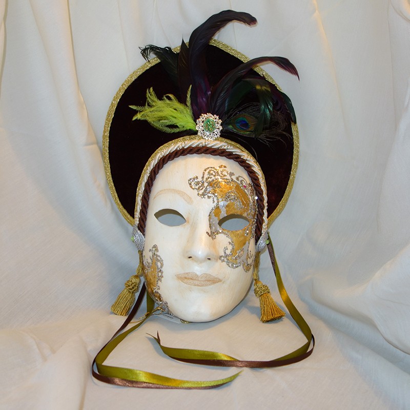 Hand made and decorated with Velvet Crown, feathers including a peacock feather, gold and silver leaf, trim and tassels on traditional paper made mask using the 16th and 17th century style of mask making in Italy by award winning artist. This mask is wearable and collectible. Makes a beautiful pair with the Princess.