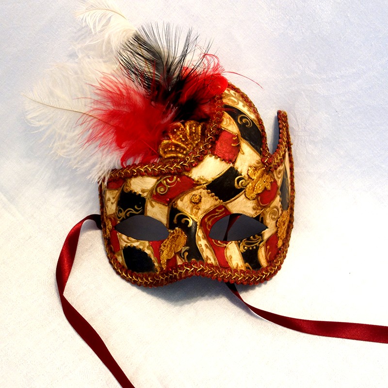 Venetian Half Mask with Feathers in Harlequin design by Artist Carla Almanza in the traditional 16 to 17th Century style of mask making in Italy using Carta Pesta and Gold Leaf. Collectible, Wearable Art.