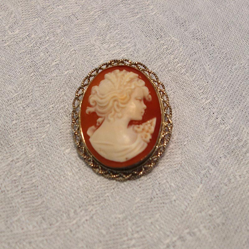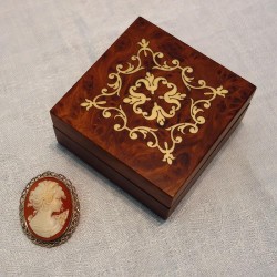 The cameo has a gold filigree around the outside and is made to wear or to pin. And many have them mounted to hang on the wall and enjoy all day. The box is inlaid wood from Sorrento and included.